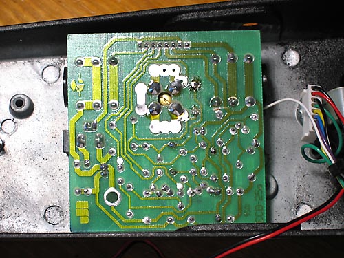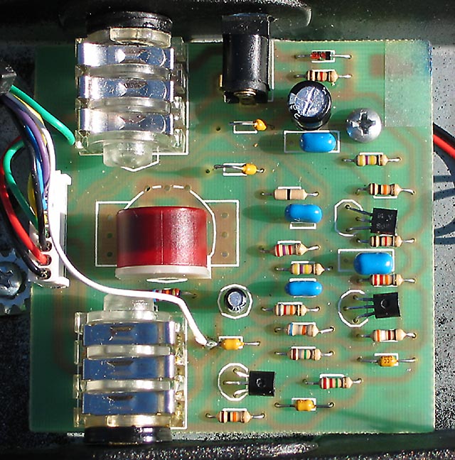 del anteriormente citado Stuart Castledine y que os recomiendo encarecidamente como referencia esencial antes de modificar un Wah. Por cierto que en el wah, tal y como me llegó, ya estaba hecho el "Vocal Mod" que podréis leer en esa página y que se ve claramente pues es la única resistencia "roja" de toda la placa. En la siguiente foto podéis verlo todo con muchísimo más detalle.