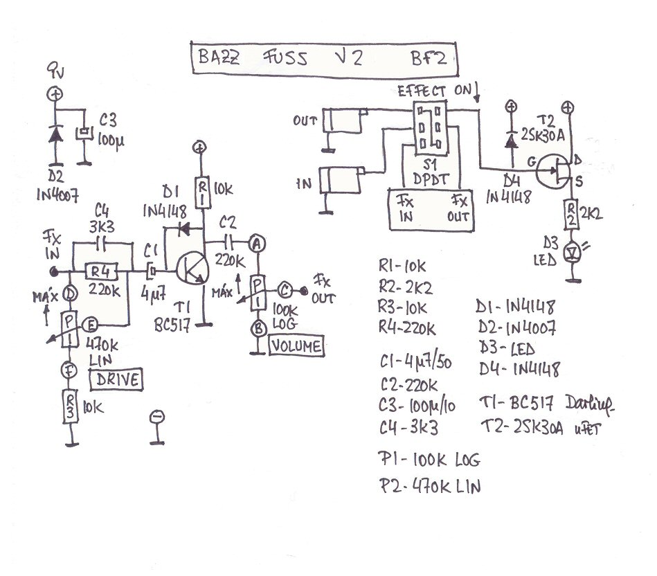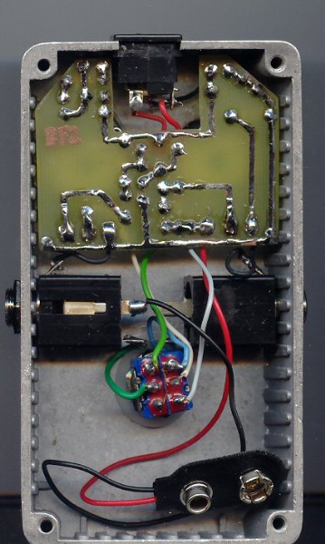 Primero monté la versión 2 (la del darlington) y el sonido me encantó. Dulzón y no excesivamente agresivo. El caso es que me dí cuenta de que si bajaba el volumen de la guitarra el efecto cambiaba de Fuzz a una especie de Treble Booster. No bajaba el nivel de sonido sino que lo limpiaba; ganaba en agudos y no tenía una bajada de volumen verdaderamente evidente hasta que el pote de la guitarra estaba casi al mínimo.