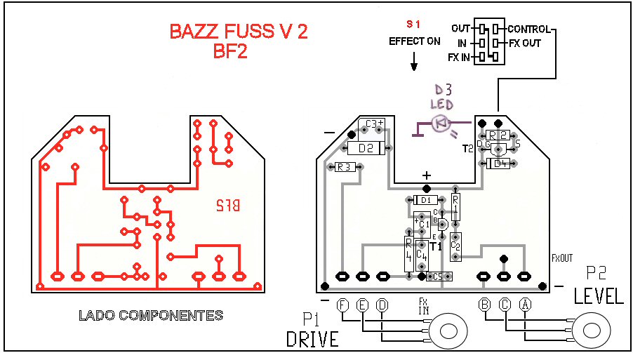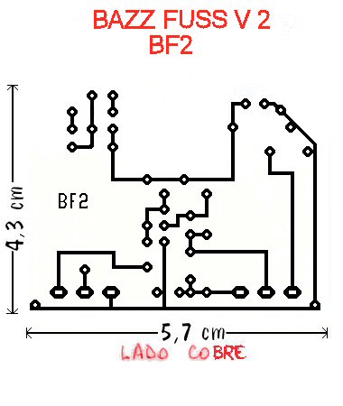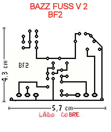 Debido a la disposición geográfica de mi casa en relación con un repetidor de la cadena SER tengo la desgracia de escuchar esa emisora de radio con mucha más frecuencia de la que desearía. Hace unos días descubrí aterrado que mi queridísimo Bazz Fuss ejercía labores de antena de radio sin que nadie se lo pidiera ni agradeciera. Leyendo documentación por ahí se me ocurrió añadirle un condensador de pequeña capacidad entre la entrada del circuito y masa. Le puse C5, de 100 pF y dejé de oir automáticamente los 40 principales, programa, por cierto, que he llegado a odiar porque se me cuela hasta por el teléfono. Yo no aprecio cambios sustanciales en el sonido del efecto y, desde luego, la radio ya no se oye. Aquí podéis ver el esquema, la placa con componentes y el fotolito con el condensador que os he comentado en su sitio.