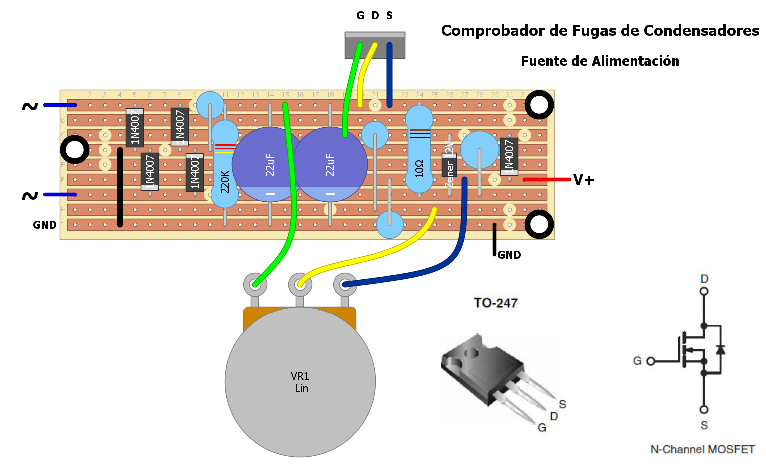 En la misma placa podéis incluir si queréis la resistencia de 10K 2W que para descargar el D.U.T. A continuación, la imagen "transparente" pues algunos cortes de pistas también quedan semiocultos por los componentes: