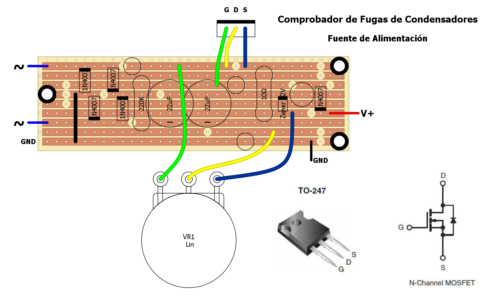 Como veis, incluyo los dos condensadores de 22uF 450V por lo que ya comenté con antelación, pero podéis sustituirlos por uno solo si es que os parece mejor y lo tenéis disponible. El FET está montado sobre el propio chasis del proyecto y por eso lleva unos cables en el dibujo y aparece fuera de la placa. No olvidéis de separar eléctricamente la aleta de refrigeración del FET del propio chasis mediante una "mica" o similar, así como el uso de silicona térmica para facilitar la transmisión de calor al chasis. Respetad la posición de los diodos y el/los electrolítico/s. Los círculos negros grandes son sólo agujeros para pasar unos separadores y así poder fijar la placa al chasis cómodamente.