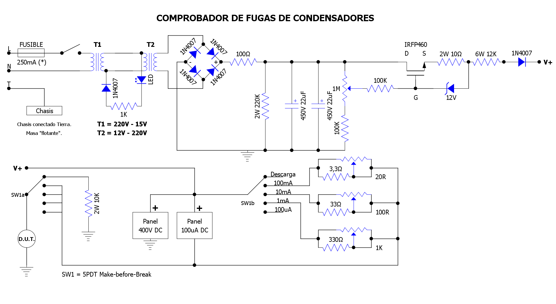 La teoría de funcionamiento es bien sencilla: aplicamos una tensión DC a un condensador y medimos la corriente que pasa entre sus terminales. Según esta sea mayor, menor o ninguna el condensador tendrá más o menos fugas o ninguna. La alimentación DC debe ser variable pudiendo llegar a un valor suficiente como para vérselas con electrolíticos de varios cientos de voltios y la medición de corriente ha de ser a la vez muy sensible y muy robusta para evitar fallar en la eventualidad de encontrarse con un condensador cortocircuitado.