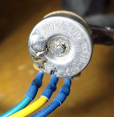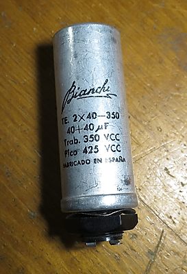 Tenemos un condensador típico de radios de válvulas. Un Bianchi doble 40uF + 40uF y 350V (WVDC):