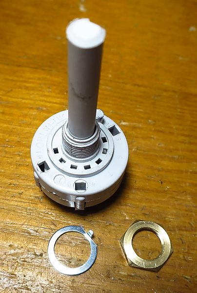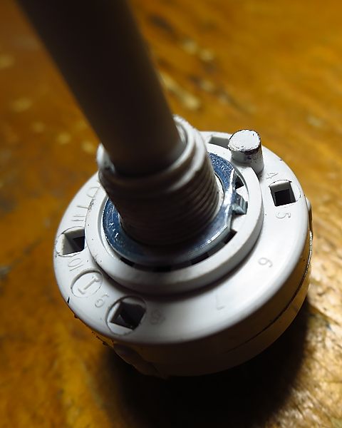 Con respecto al conmutador que he comprado en ebay, podéis ver que es de 6 posiciones (6PDT) en vez de las 5 requeridas (5PDT). En realidad es regulable pues alrededor de la rosca tiene un círculo de agujeros y un anillo móvil con un tetón que, dependiendo de en qué agujero lo introduzcamos, podremos seleccionar entre 2 y 6 posiciones. Limitándolo a 5 nos queda al pelo.
