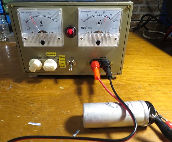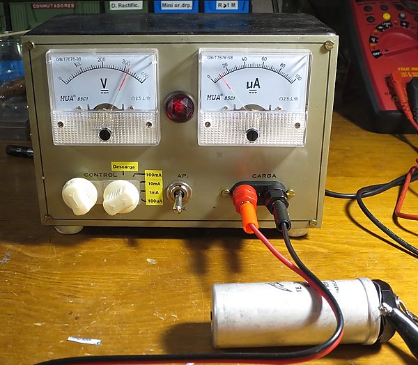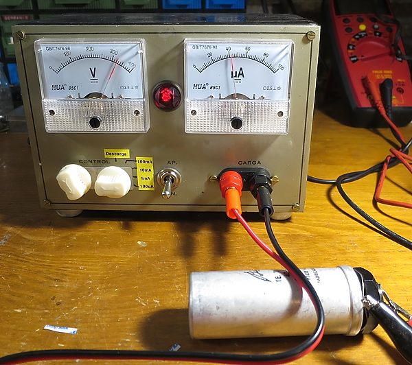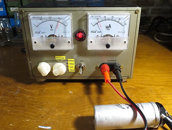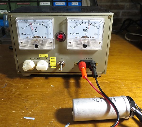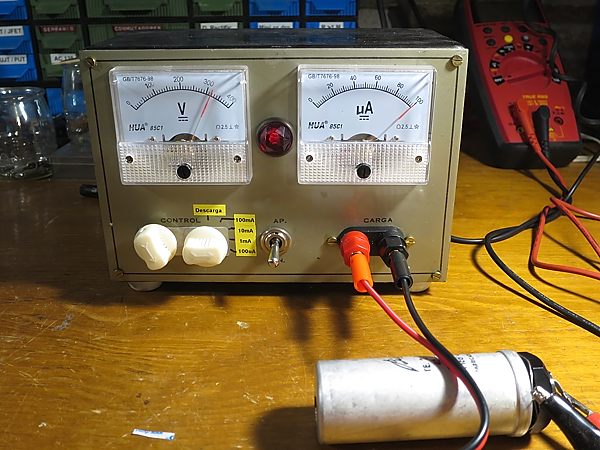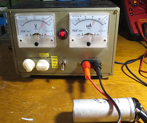 Mientras vamos subiendo la tensión debemos ir vigilando con cuidado el panel del microamperímetro. Si detectásemos que según subimos la tensión el microamperímetro nos marcase unos 15mA o más debemos inmediatamente bajar la tensión al mínimo y poner de nuevo el conmutador en la posición de "Descarga" pues este condensador tiene demasiadas fugas y es susceptible de estar incluso cortocircuitado.