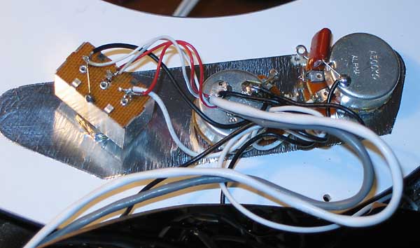 El truco de este esquema está en el switch. No es el típico switch asiático que traen las copias de Gibson. Aunque físicamente son idénticos (excepto por el actuador todo metálico) no tienen nada que ver por dentro ya que los normales son On/On/On y este es On/Off/On, esto es, en la posición intermedia no hay ningún contacto eléctrico entre los tres terminales. Si os fijáis en el esquema veréis que justo por eso en esta posición las dos pastillas quedan en serie y no en paralelo como nos acostumbran Gibson, Fender, etc. Debéis tener mucho cuidado con el switch ya que será difícil conseguir un repuesto. Afortunadamente este tipo de switch es también el que necesitamos para poder poner el cableado tradicional si así lo queremos. Switches del tipo Gibson los hay a patadas en internet pero de estos no he sido capaz de encontrar ninguno. La única solución a un posible switch roto que he encontrado es ir a Dan Guitars y encargar todo el conjunto de switch, potenciómetros, cableado y arnés para zurdos que lleva este mismo switch incluido pero, claro, es una solución bastante cara. No siempre lo tienen como repuesto. A fecha de hoy no existe sólo el switch como repuesto aunque algunas veces sí que lo he llegado a ver en Dan Guitars como repuesto independiente pero debe ser difcil de encontrar incluso para ellos porque normalmente no lo tienen disponible. En internet los podéis encontrar parecidos. Sólo tenéis que ir a Google y buscar por "SPDT On/Off/On" y los encontraréis, que seguro que serán de mejor calidad (el original no es gran cosa...) pero si queréis el "auténtico" y no lo tienen, tendréis que comprar todo esto, que normalmente sí que está disponible: