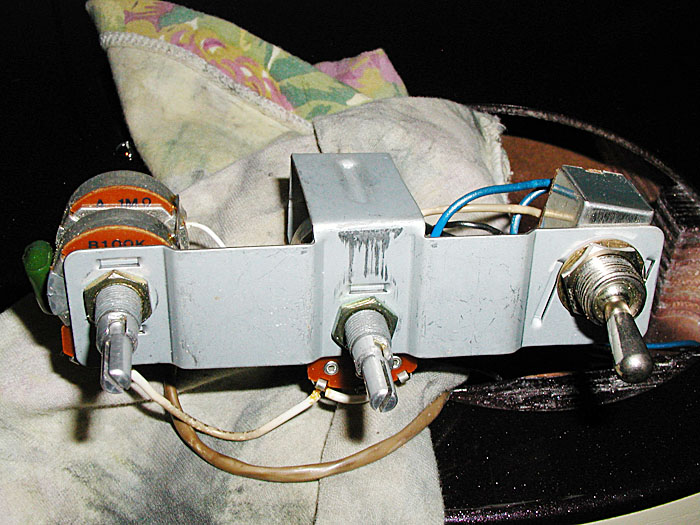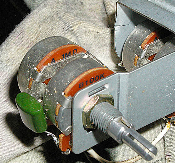 He conseguido unas fotos detalladas de los potenciómetros originales de las primeras reediciones de Danelectro, que sí llevaban el "combo" en tándem. En este caso son de una U2 pero para el caso es lo mismo pues llevaban idéntico cableado: