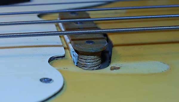 Para intentar solucionar el problema de quintaje mucha gente lo cambia por alguno compensado como por ejemplo el fenomenal Wilkinson Tilt Saddle. El respetar el puente original no permite un quintado 100% fino pero se puede llegar a un compromiso usando cuerdas de entorchado plano con lo que algo se mitiga el problema. Otra opción sería el doblar los tornillos de ajuste para darle inclinación a las silletas pero eso es algo que he preferido no hacer en un instrumento de esta edad.