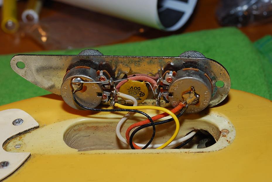 La electrónica es completamente original. Los potes son CTS del año '66. En este año Fender compró un stock muy grande de potenciómetros a CTS y estuvo los siguientes años poniéndolos en sus guitarras y bajos por lo que no son buena fuente para fechar la guitarra. Los potes son de 250K y el condensador es de lenteja grande de 50nF típico de esa época. Los controles y el jack (Switchcraft) son completamente originales y nunca han sido retocados.