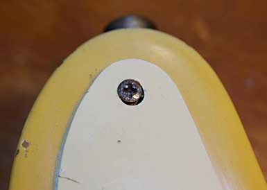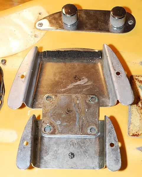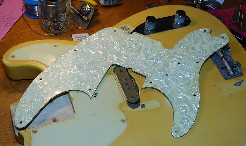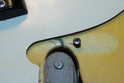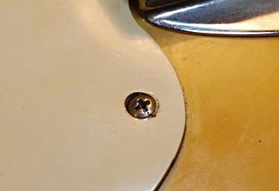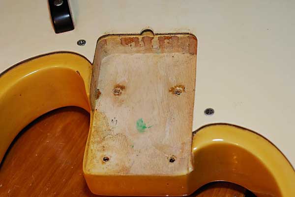Si os fijáis bien se puede apreciar claramente como ha encogido el golpeador con el paso del tiempo haciendo ovalados algunos agujeros de los tornillos por efecto de la tracción así como separando el rebaje de la placa de potes. Esto es muy común en guitarras y bajos de esta edad y más antiguos.