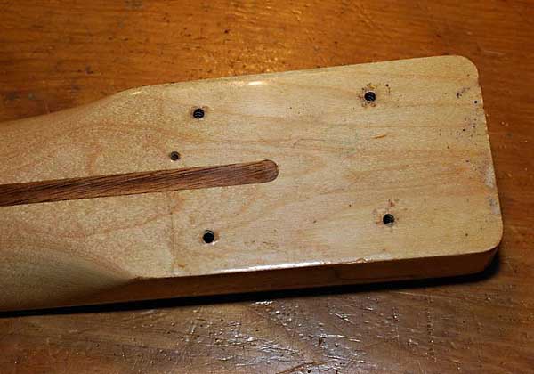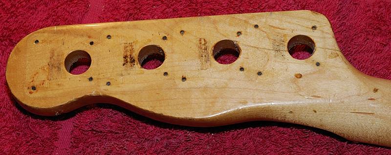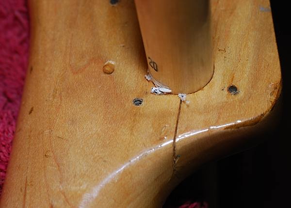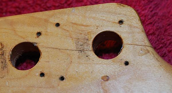Supongo que a causa del golpe que hizo semejante grieta, los cuatro tornillos del clavijero de Mi estaban bastante flojos y uno de ellos, que probablemente se perdería con el golpe, fué sustituido por un tornillo convencional como hemos visto más arriba. Aparentemente esa clavija no está torcida por el golpe pero sí que es verdad que va sensiblemente más dura que las otras tres. Los agujeros de los tornillos fueron reparados con el viejo truco del palillo de dientes y cola.