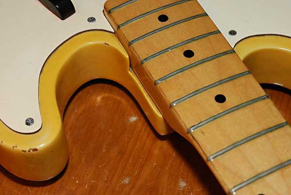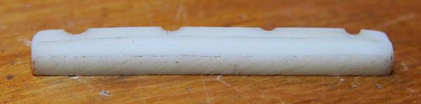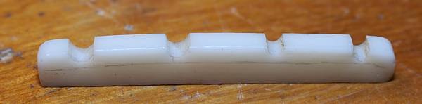 La cejuela no es original pues es de hueso y Fender no hacía cejuelas de ese material desde sus primerísimos años. Curiosamente la base de la cejuela es plana, no curva como debería ser ya que la ranura original era así... la misma máquina que tallaba las ranuras de los trastes en curva hacía al mismo tiempo la ranura de la cejuela y por eso era también curvada en su base. El "luthier" que hizo el cambio no se le ocurrió mejor idea que aplanar también la base de la ranura en el mástil. Está bastante bien hecho pero no deja de ser una faena.