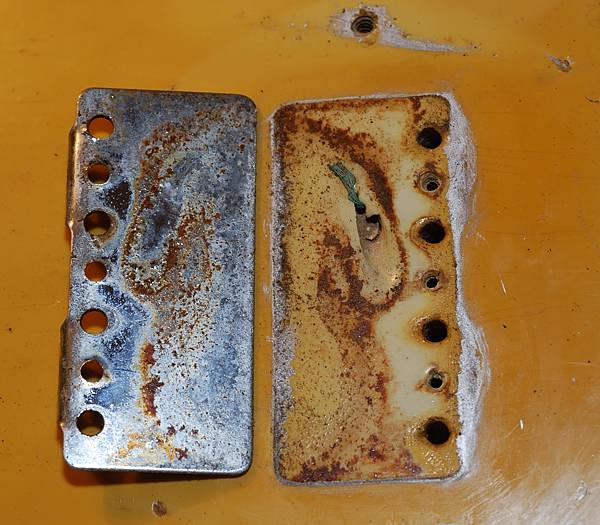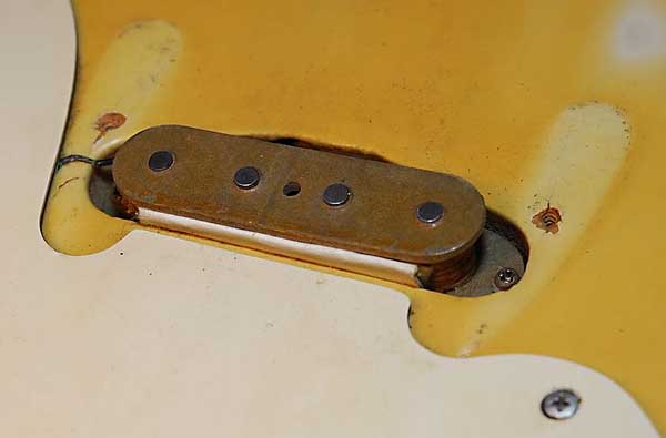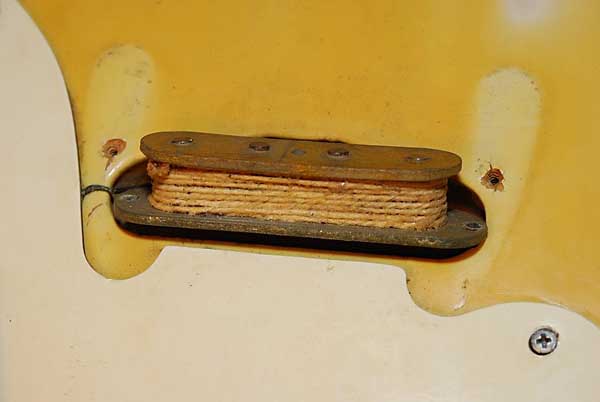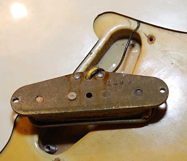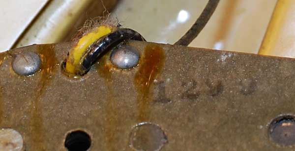 Como ya dije más arriba, la pastilla está en estupendo estado de conservación pero ese no es siempre el caso. Por ejemplo aquí podéis ver un par de fotos que me ha pasado Enrique García de una igual de otro Telecaster Bass que no ha tenido tanta suerte, por lo que tuvo que rebobinarla: