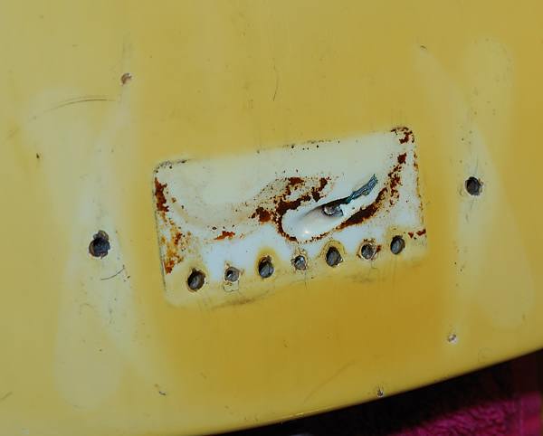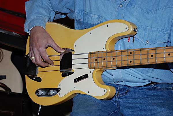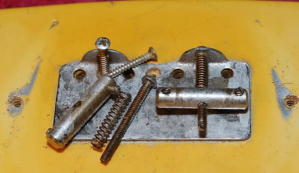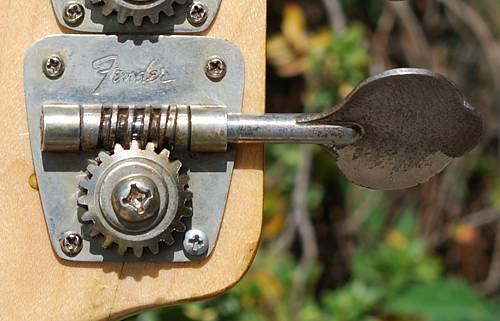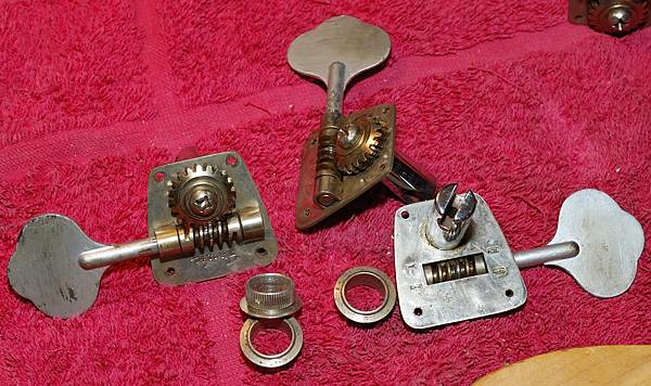 Según me cuenta el dueño y debido a la corrosión de algunos elementos metálicos del bajo, hace años que se repintaron varias piezas con "purpurina" para adecentar su aspecto. De ese modo aparecen en varias fotos de este reportaje las "orejas de elefante" de las clavijas, el puente en su totalidad, el "string retainer" y los tornillos del golpeador, de la placa de potes y del reposa-manos. Para devolverle al bajo ese aspecto "vintage" original que se ha ido ganando a base de trienios, he eliminado la pintura de los elementos metálicos con decapante y mucho cuidado.