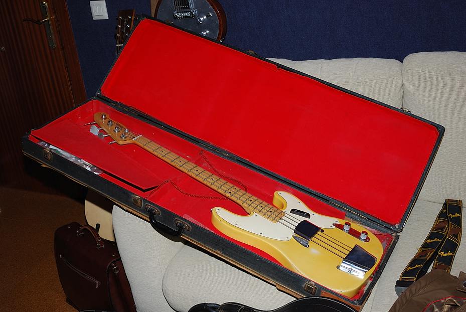 Es estuche no es el original Fender pero sí que es el que originalmente vino al comprar el bajo. Es el típico de Leturiaga de los '60-'70. Parece ser que por aquella época Leturiaga importaba las guitarras y los bajos sin los estuches originales y luego ellos mismos añadían unos hechos aquí, de peor factura, mas económicos y con una chapa en la que se indicaba la dirección de la antigua tienda de Corredera Baja de Madrid. Como podemos ver este ejemplar muestra las señales del paso del tiempo.