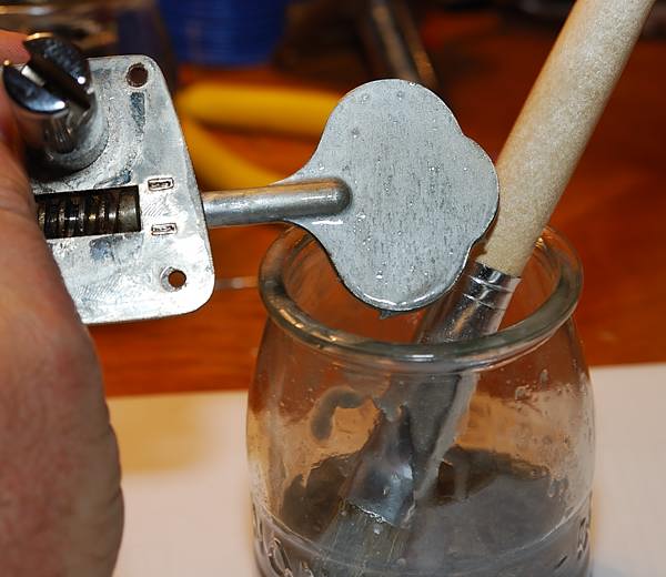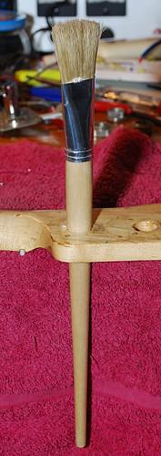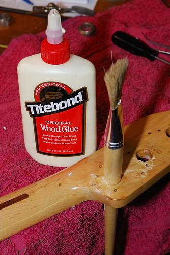 Para arreglarlo utilicé el mango de una brocha redonda a modo de cuña cónica para así poder abrirlo un poquito, lo suficiente como para hacer entrar algo de cola Titebond.