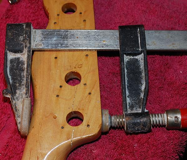 Tras quitar la brocha y limpiar el exceso de cola con un trapo húmedo, afiancé la unión con un "sargento" y tras un par de dias de reposo quedó fenomenal.