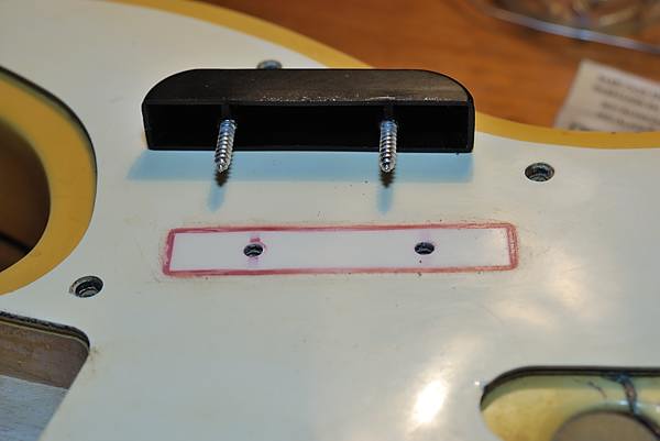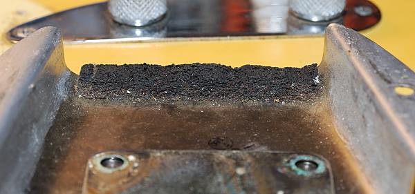 Si os fijáis bien en las fotos veréis que tiene un suplemento de papel enrollado en la parte más cercana al mástil. Sin él la pastilla tiende a inclinarse demasiado debido a los cables. Con el "cenicero" puesto ni se ve así que lo he dejado como estaba.