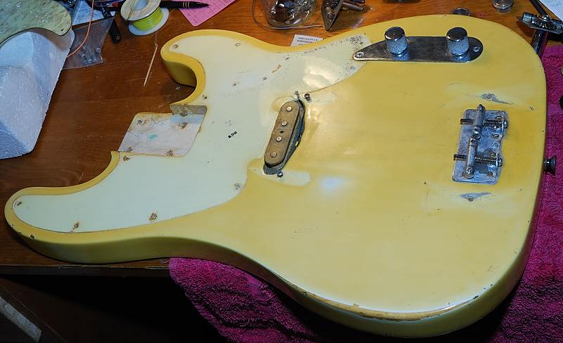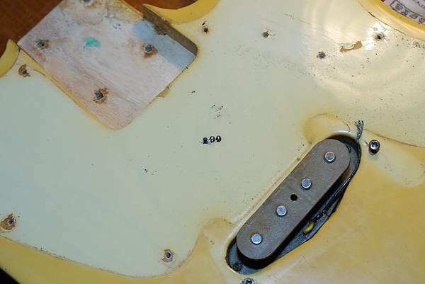 En el proceso de pintado de la "purpurina" también se escaparon algunos brochazos que mancharon el cuerpo en la zona del puente así como otras manchas en esa zona que más bien parecen causadas por atornillar el "cenicero" del puente recién pintado mientras aún estaba fresca la pintura. Para eliminar las manchas de esas zonas evidentemente no se pudo usar decapante pues habría disuelto todo el grueso poliéster del acabado del cuerpo (dejaron de aplicar nitrocelulosa a partir del '68) así que con una dosis de "polish" de guitarras, una dosis aún mayor de "brazo" y un trapo de algodón, tras un buen rato de duro trabajo desaparecieron por completo.