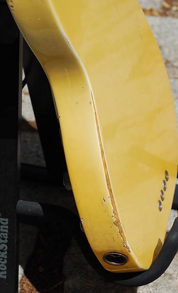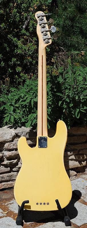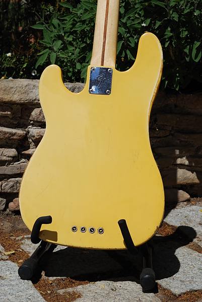 El cuerpo de este bajo es de un fresno ligero y aparentemente es de una sola pieza aunque no se puede asegurar del todo porque la capa de pintura es bastante más gruesa que la que se utilizaba años atrás. Al levantar el golpeador podemos apreciar cómo ha amarilleado el acabado expuesto a la luz y bajo este podemos ver el "blonde" original.