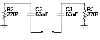 Para solucionar esto es tan sencillo como usar un SPST (un interruptor single pole single throw), que lleva 2 patitas nada más. Levantamos la patita de tierra de ambos condensadores, y conectamos cada una a una patita del SPST. Cuando el interruptor está abierto ambos condensadores están desconectados, cuando se cierra, ambos extremos negativos de los condensadores están conectados entre sí (pero NO A TIERRA), y establecen una tierra virtual, con CERO ruido al accionarlo, se puede cambiar sobre la marcha.