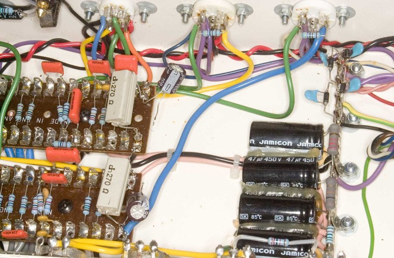 Como opciones os comento que podeis dejar el valor original de condensador, en vez de dividirlo por 2, lo que si he comprobado que es muy importante es que los 2 condensadores sean del mismo valor, por error probé el ampli con un condensador de 100 mF otro de 63 y sonaba fatal…En cuanto a la resistencia, si hay que redondear y quereis que el ampli suene más “caliente” redondear por abajo, y si quereis ir más seguros y que las válvulas os duren más, por arriba. Es decir, si vuestra resistencia original es de 150, y teneis dudas entre ponerle una de 270 y otra de 320, pues lo dicho anteriormente. Yo me iría sin dudar a la más baja.
