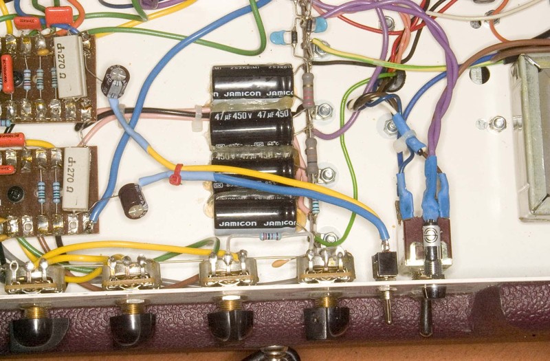 El tono cambia poco (si acaso para bien) una vez reducida la potencia, no baja nada la saturación, sino simplemente el volumen…En el caso del Cornford Hurricane, con la reducción de potencia es exactamente igual que lo que yo recuerdo del Harlequín, tanto en potencia como en tono. Si queremos hacer regulable esta modificación, en vez de un interruptor se usa un potenciómetro de 1 Megaohm entre ambos condensadores, pero yo no le veo mucha utilidad, me parece mas simple y mas interesante un interruptor con las 2 posiciones.