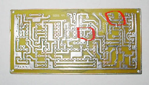 Una cosa que recomiendo encarecidamente es que pongáis un diodo de protección contra inversiones de polaridad. Podéis intercalarlo en cualquier parte del circuito donde vayan cercanas las vías de +9V y masa (pistas Rojo y Verde respectivamente en el pdf). El método es muy sencillo, poned el diodo rectificador (de la serie 1N400x siendo la x cualquier número entre el 1 y el 7) al revés, con el cátodo (la "rayita") a +9V y el ánodo al masa de un modo análogo a como se explica en la página de la