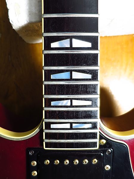 El diapasón es, según dicen, de ébano aunque más bien parece de palorrosa teñido de muy oscuro. Es cierto que hay ébanos que dejan ver unas vetas parecidas a las del palorrosa pero el poro es muy diferente. En cualquier caso, es un diapasón estupendo de 14" de radio y con incrustaciones de abalón en forma de trapecio partido, típicos de estas guitarras y bastante bonitos en mi opinión.