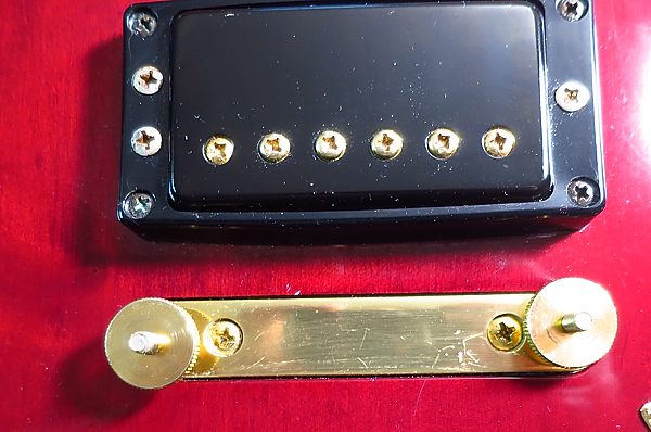 Los cableados son modernos y tienen una conexión coil tap que es aprovechada por la circuitería de los potenciómetros. Los soportes de las pastillas llevan el utilísimo sistema de tres tornillos con muelles que permite no solo ajustar la altura a la perfección sino que permiten el posicionarlas perfectamente paralelas a las cuerdas. Las carcasas exteriores van pintadas de negro dando un efecto muy chulo junto al dorado del resto del hardware.