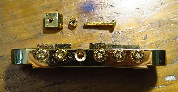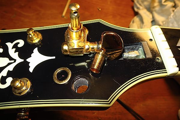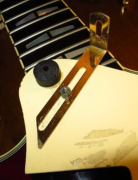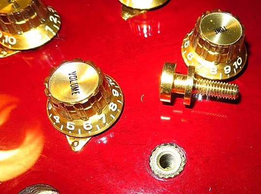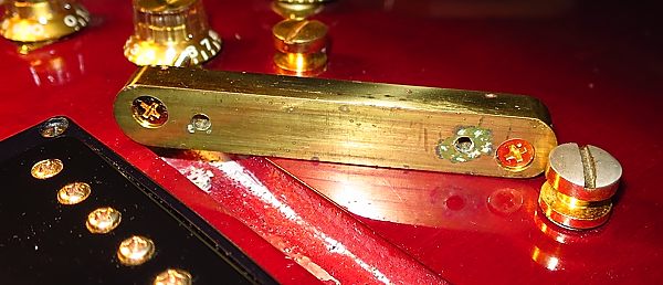 Se apoya en unos tornillos, estos si, de acero. La cabeza de estos tornillos tiene una medida diferente a la de los Gibson, es abombada y la rosca es métrica.