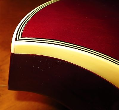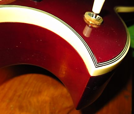 El acabado creo que es poliuretano. Desde luego no es nitrocelulósico pero tampoco es tan "plasticoso" como un poliéster. El caso es que es un acabado fino y muy agradable al tacto. El color es Burgundy uno de los tres disponibles en el momento junto al Negro y el Naranja sunburst.