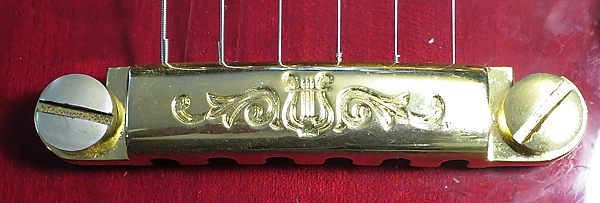 Otra de las características típicas de estas guitarras es el puente con su placa inferior de latón para dar más masa y sustain al conjunto... y más peso, claro. Etiquetado en la trasera como "YAMAHA", es una curiosa construcción un poco mezcla entre el Gibson ABR-1, por el sistema de ajuste de altura, y el Gibson "Nashville" por el alcance de las silletas y aspecto general.