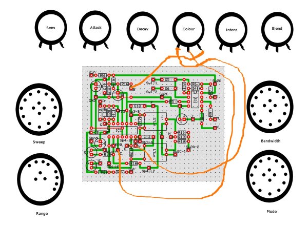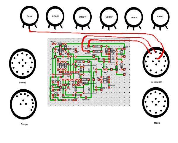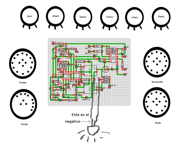 Otra cosa que nos va a ayudar a saber si el filtro está funcionando bien es el LED verde del pedal, que indica la intesidad que está llegando al filtro. Brilla más o menos dependiendo la fuerza con la que le dés a las cuerdas. Por cierto que en el original este LED funciona incluso cuando el efecto está en "OFF", ya que no es true-bypass, pero el mío sí que es true-bypass, así que al LED no le llega señal de entrada y no puede "reaccionar". En cuanto al LED rojo, lo hice con un circuito de