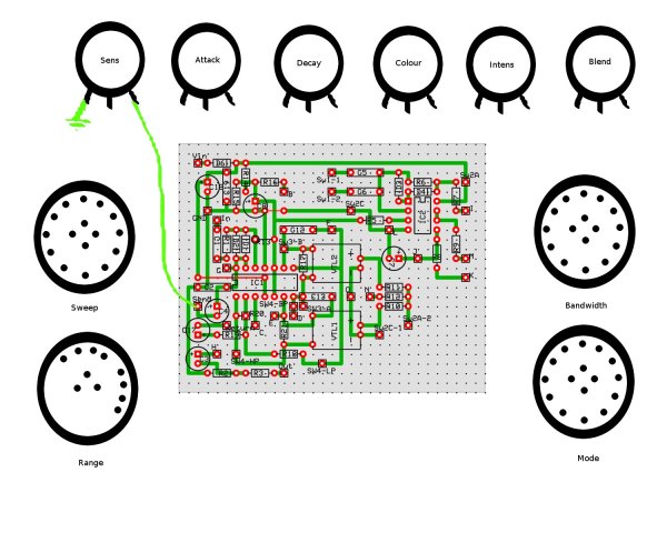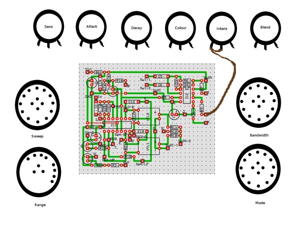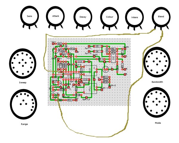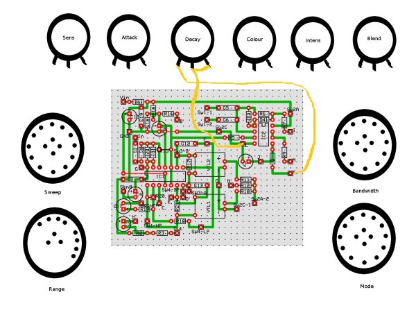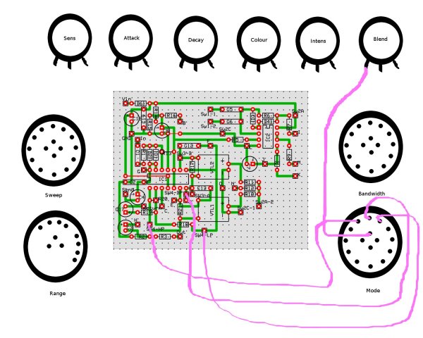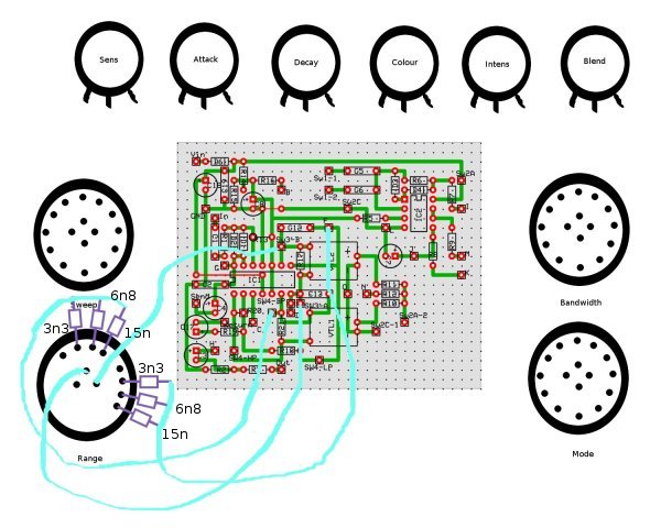 Incluye un potenciómetro que no suelen incluir los Envelope Filters pero que a mi se me antoja fundamental, que es el "Decay", con el que, como su nombre indica, controlas la velocidad de "caída" del efecto. Con el se pueden regular un montón de sonidos, tanto agresivos con el decay corto, como tipo "phaser" con el decay mas largo.