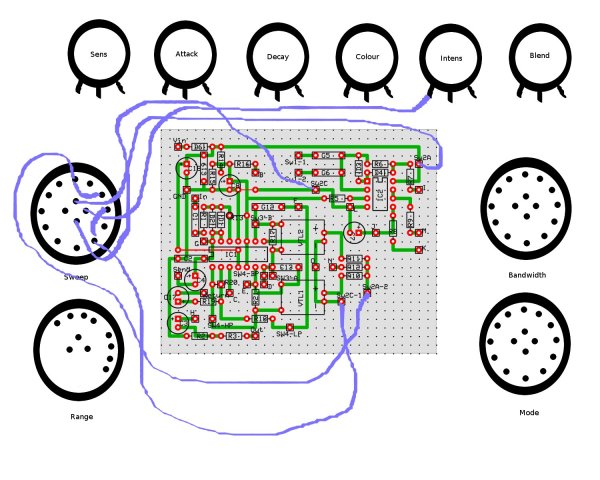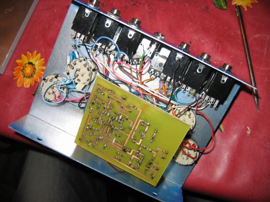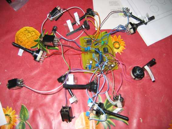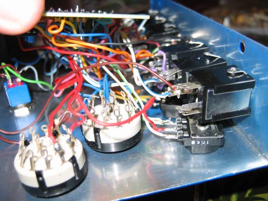 Recomiendo que la construcción se lleve a cabo con mucho cuidado, ya que la cantidad de switches y potenciómetros hacen que aumenten las posibilidades de cometer un desliz, siendo un auténtico dolor tracear todo en busca de un fallo. Aquí os pongo una foto de mi "Makoki", para que veáis la cantidad de cables que tiene el bicho (y eso que en esta foto faltaba todavía añadir los dos jacks para los pedales de expresión y el circuitillo del Millenium bypass con el DPDT correspondiente:Construcción y Esquema