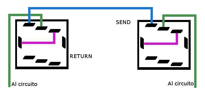 Cuando no hay ningun jack conectado, la 3 esta conectada con la 4, y la 6 con la 7. Cuando conectamos un jack, la 4 pasa a estar conectada con la 5 y la 7 con la 8. Así nos aprovecharemos de esto para conseguir que "Send" esté conectada con "Return" cuando no haya jack y cuando haya jack la señal vaya por donde tiene que ir. Asi:
