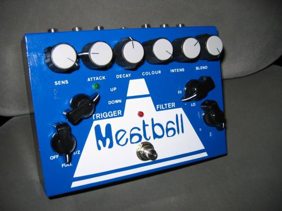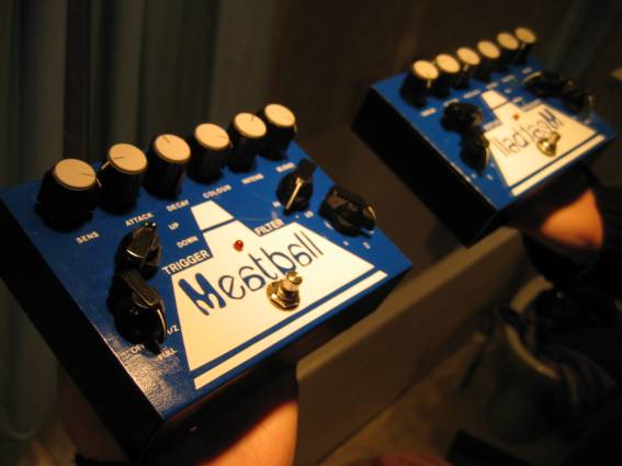 El Meatball es un efecto actualmente buscadísimo. Lo construyó durante unos años una pequeña empresa inglesa, Lovetone, conocida entre los freakies de los efectos por hacerlos de una calidad suprema y también por sus infinitas posibilidades de configuración, es decir, por sus muchos potenciómetros y switches. Podéis visitar la página oficial para ver otros pedales que hacían, como el "Brown Source", el "Ring Stinger" (otro de mis anhelos), etc etc. Ademas podéis escuchar clips de audio de cada unidad.