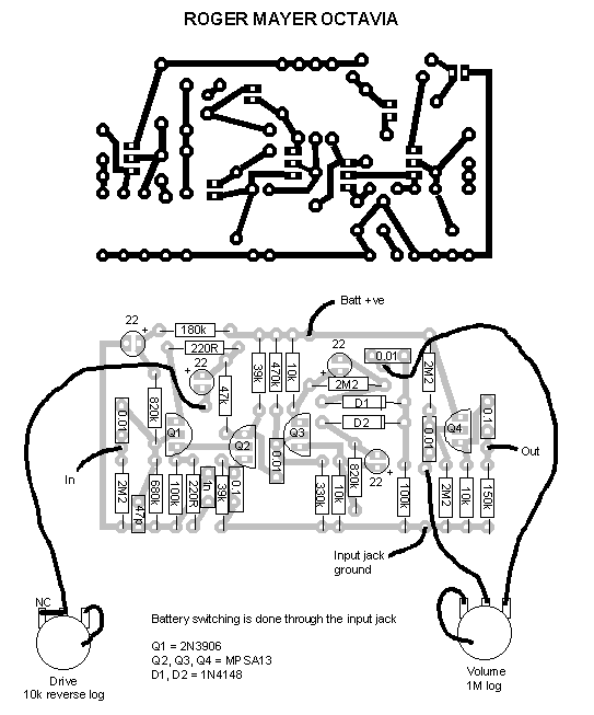 El otro transistor, el 2N3906, es algo un poco insólito pues es un transistor PNP en un circuito en el que el resto de los transistores es NPN. Mucho ojo pues el "colector" está hacia abajo en el esquema... no os confundáis al ponerlo. De todas formas el circuito final, a pesar de este PNP, es de "masa negativa" lo que nos crea muchos menos problemas que tros tipo fuzz de Germanio.