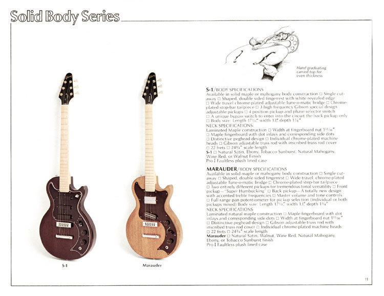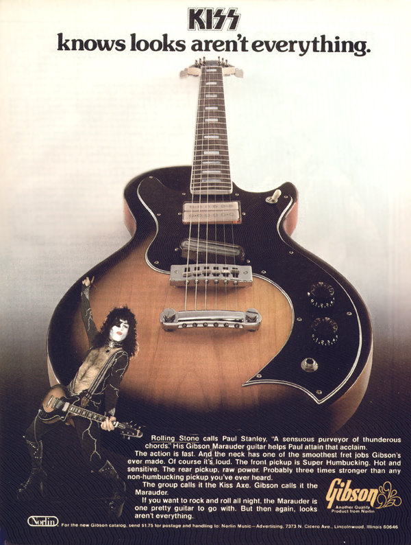 Podemos ver en el catálogo original de 1979 la Marauder "tipo 3" con cuerpo de caoba junto a la S-1 y también este otro catálogo de 1979 con toda la gama.. Estas guitarras fueron respaldadas por los mismísimos KISS como podemos ver en este cartel de 1976.