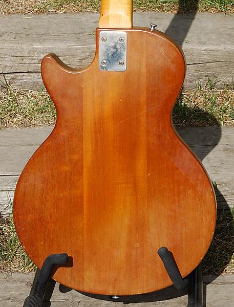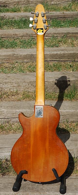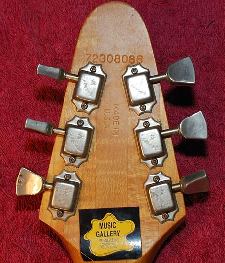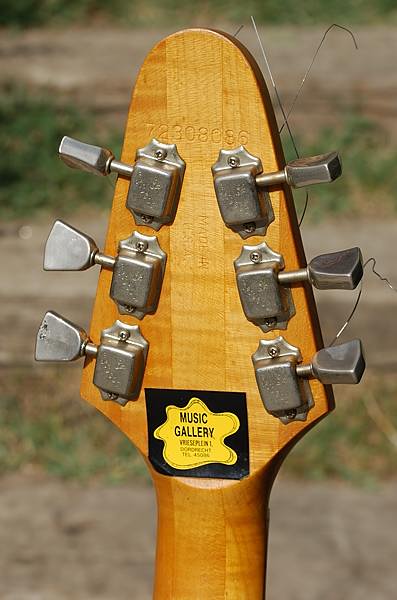 La pala de este modelo es, en mi opinión, uno de los grandes aciertos de esta guitarra pues le dá un aspecto muy atractivo y muy moderno (entonces) que pienso que encaja perfectamente en el conjunto. Por detrás nos muestra una "voluta" típica de la época.
