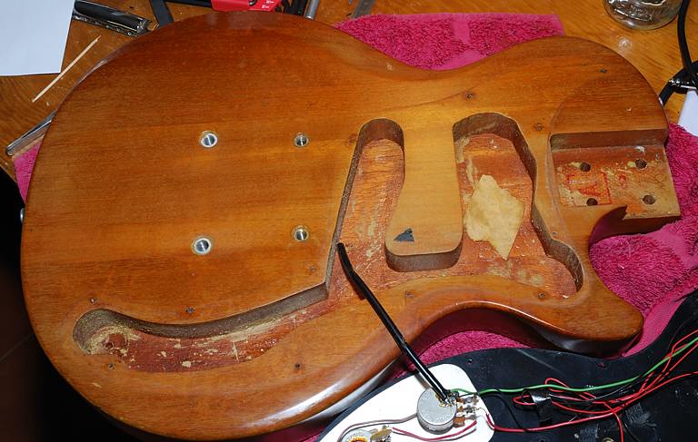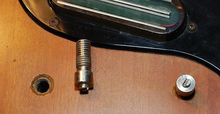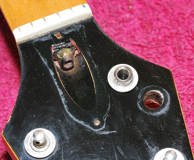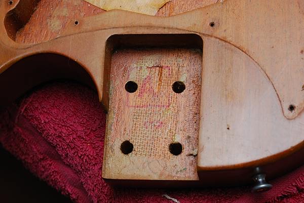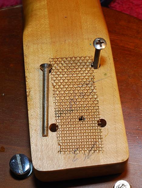 Esa malla de alambre dorado estaba entre el mástil y el pocket. No es original pero si nos fijamos bien en seguida nos damos cuenta de por qué la han puesto ahí. Viendo los tornillos de anclaje del mástil nos damos cuenta de que no es el mismo sistema que usan Fender y tantos otros. Estos utilizan tornillos de rosca-madera que atornillan directamente en el mástil sin embargo estos son de rosca-tuerca.