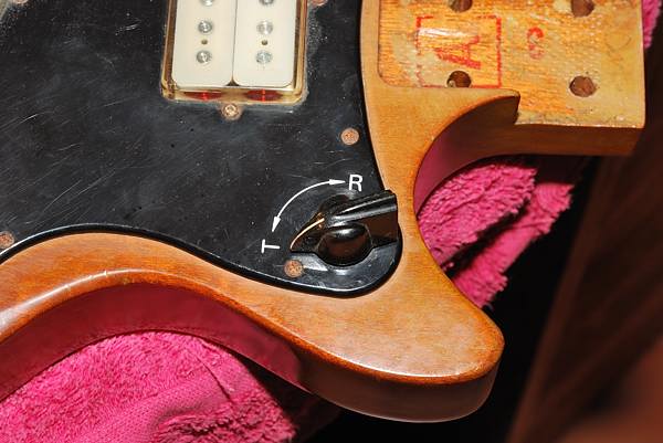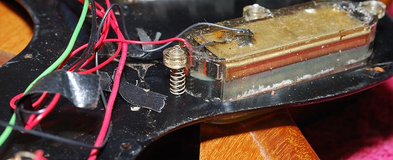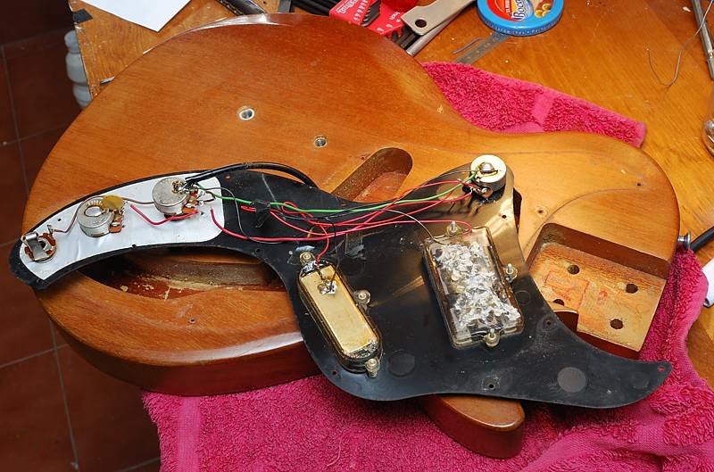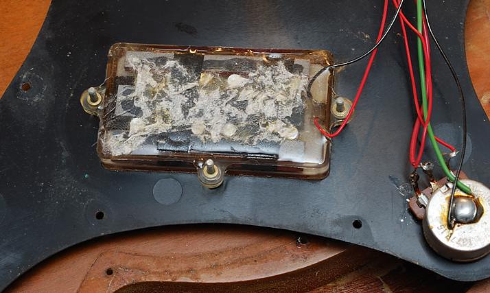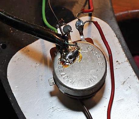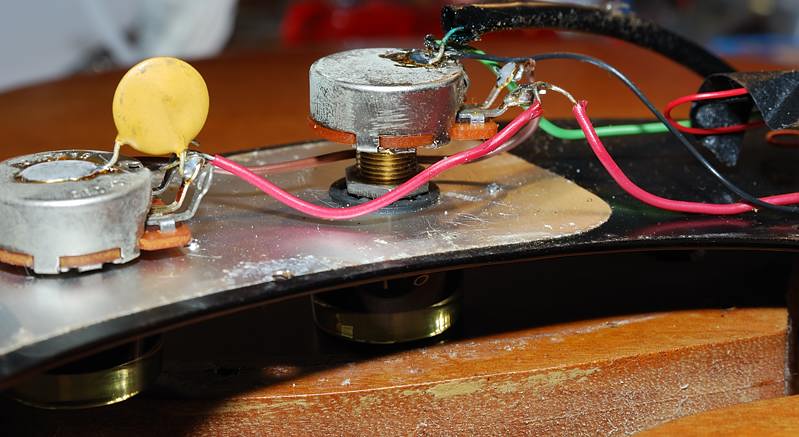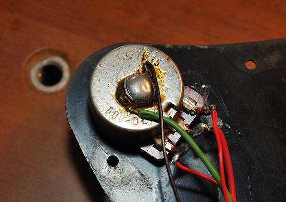 Este pote ha sido sustituido de una forma un tanto chapucera (tuve que repasar una soldadura fria) rompiendo unas cintas de papel adhesivo que se encargaban de mantener ordenado el cableado debajo del golpeador. Un pote de volumen de 1MΩ frente a los 300KΩ que debería llevar hace que la guitarra suene con más volumen, lo que quizá era un efecto buscado vista la poca salida de las pastillas, pero también más estridente y con más agudos de los deseables por lo que le he sugerido su reemplazo al dueño de la guitarra.