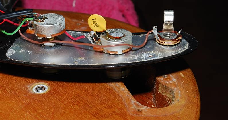 En cuanto a los controles también tienen su tema aparte. Esta guitarra, como ya dije, es el segundo modelo en el que se sustituyó el típico switch Gibson por un potenciómetro de "blend" que permite hacer la transición de una pastilla a otra de modo gradual. Todos los controles y pastillas están montados sobre el golpeador en el más genuino estilo Fender con vistas a abaratar el producto. Los controles de volumen y tono están al lado del jack y alejados del "blender". Si os fijáis en esta foto veréis que el jack no tiene cable de masa sino que esta se hace a través del pequeño apantallado trasero. De nuevo un método usado por Fender en varios modelos.