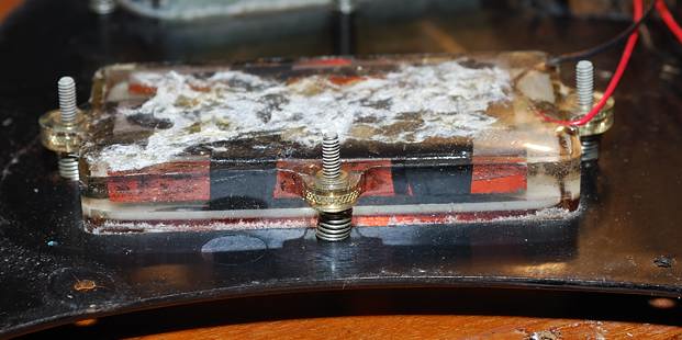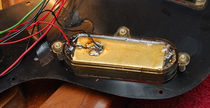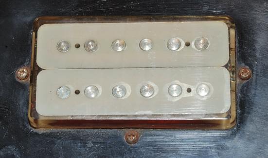 Se aprecia una buena maraña de cables ahí pero eso no es culpa de Gibson sino de alguien que estuvo tocando por ahí como ya veremos. Fijáos bien en las pastillas por debajo y el curioso sistema de casquillos metálicos de los tornillos de regulación de altura.