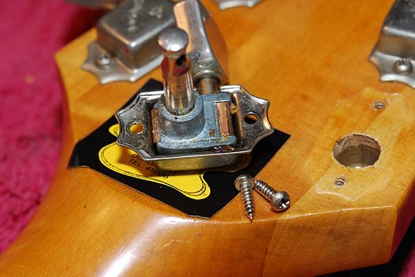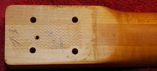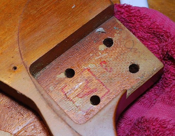 Dentro del mástil, bastante profundos, hay cuatro casquillos justo al final de cada agujero, supongo que puestos ahí desde el otro lado del mástil y antes de pegar el diapasón. En esos casquillos es donde atornillan los cuatro tornillos de fijación pero fijáos bien en el grosor del tornillo que está dentro del agujero: es bastante más fino que el agujero en cuestión. Esto hace que sea más fácil el encajar las piezas pero también hace que el anclaje se pueda mover con facilidad, algo parecido a lo que pasaba con el famoso anclaje de 3 tornillos de las Fender CBS. Este viejísimo truco de la "tela metálica" tiene tanto tiempo como estos ineficaces sistemas de anclaje y esta es la razón de las marcas de entramado, de la malla y de que el mástil ahora no se mueva ni queriendo.