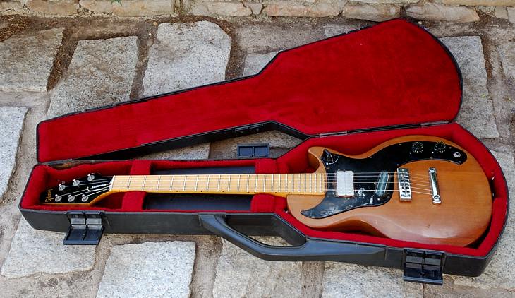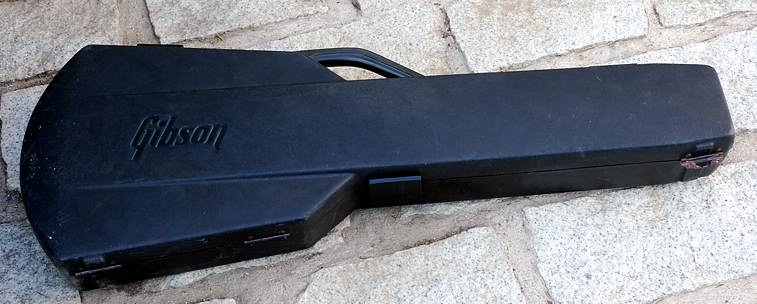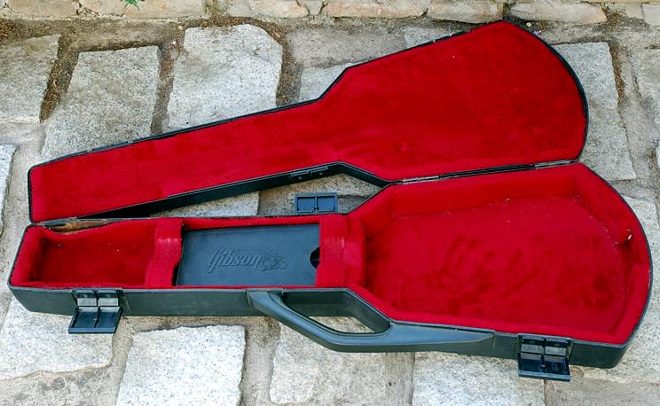 El estuche también es el original con el que venían estas guitarras, de plástico duro y con peluche rojo. Bastante eficaz aunque un poco incómodo de abrir y cerrar gracias a las presillas de plástico. Está algo estropeado por la edad y el uso pero en buen estado.