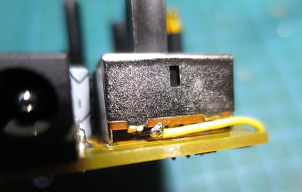 Tras esto debemos poner también un cablecillo uniendo el terminal "d" del conmutador con el terminal "a" o el "b", o con ambos, como hicimos antes. Da igual pues están unidos entre sí por el otro lado de la placa, bajo el cuerpo del switch: