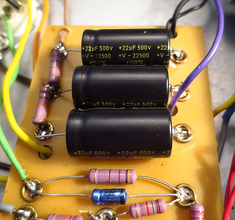 Los condensadores electrolíticos tardan un cierto tiempo en adquirir sus propiedades definitivas una vez que se usan por primera vez. Se tienen que "formar" por dentro y mientras tanto los valores que den pueden variar notablemente. Normalmente se utiliza un "variac" para esta tarea de modo que se quitan todas las válvulas menos la rectificadora (o incluso se sustituye esta temporalmente por un puente de diodos), se aplica poco a poco tensión al circuito hasta lentamente llegar a los 230V de la red normal. Cuando hice este montaje yo no tenía aún un variac así que tuve que optar por una de las dos típicas soluciones: