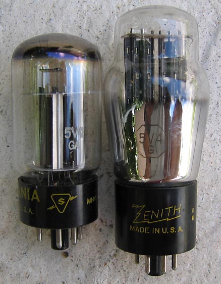 - Rectificadora: 5V4. Esta válvula tiene algo menos de impedancia interna que una 5Y3. A la par que entrega un poco más de tensión (de agradecer con la 5881) hace que el ampli vaya como más "suelto" que con la 5Y3 que hace que sea más "uniforme" todo. Es cuestión de gustos. Se puede usar también la GZ34 que da un tono como más de rectificador de diodos de silicio, a la par que más tensión aún. Las tres tienen una corriente de filamentos de unos 2A por lo que no darán problemas, pero si queréis usar una 5U4 que consume 3A necesitaréis que el transformador de alimentación lo pueda soportar, como el nuestro.